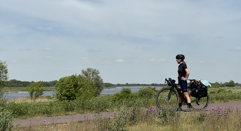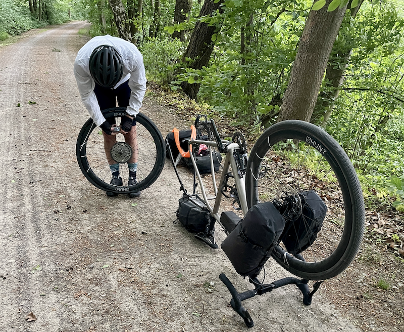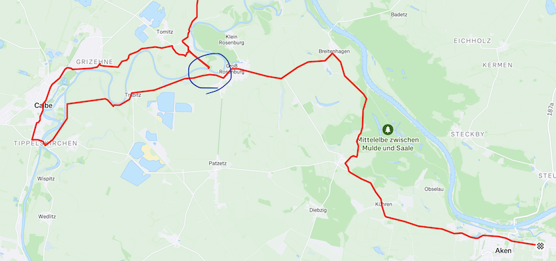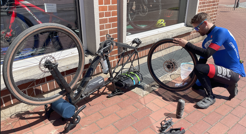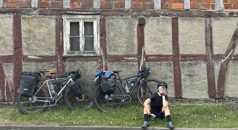 We had a long day ahead of us with around 170km of planned distance. It came as an unpleasant surprise when Tara’s rear tyre suddenly went flat just after our lunch break; the puncture was too big for the sealant to do its job. I tried fixing it on the spot with some tubeless tyre plugs, but it would not work either. Luckily we were still within the city limits of the small town of Bleckede, and according to Google Maps there were a couple of bike shops around. Yet, it took at least 45 minutes of walking around until we finally found one that not only actually still was in business, but also was open. My plan was to switch from tubeless to tubes for Tara’s rear wheel, since the tyre didn’t have too much life in it anyway. In front of the bike shop I cleaned out all the sealant replaced the tyre with a new one that I just bought, and after a bit of a messy hour we were back on track. Now with both of our bikes running tubeless in the front, and tubes in the back.