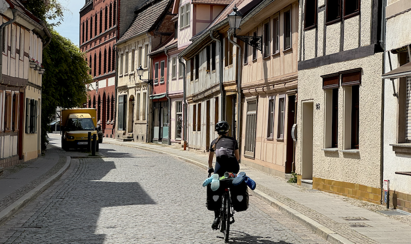 The kilometers passed by quickly, and we felt strong. When you don’t have to focus on pedaling too hard, it’s so much easier to actually take in the views around you: the typical Northern-German architecture with their thatched roofs, the flat grasslands along the river and its branches, plenty of sheep. When we arrived in the city of Tangermünde, a town founded more than 1000 years ago, it felt like going back in time.